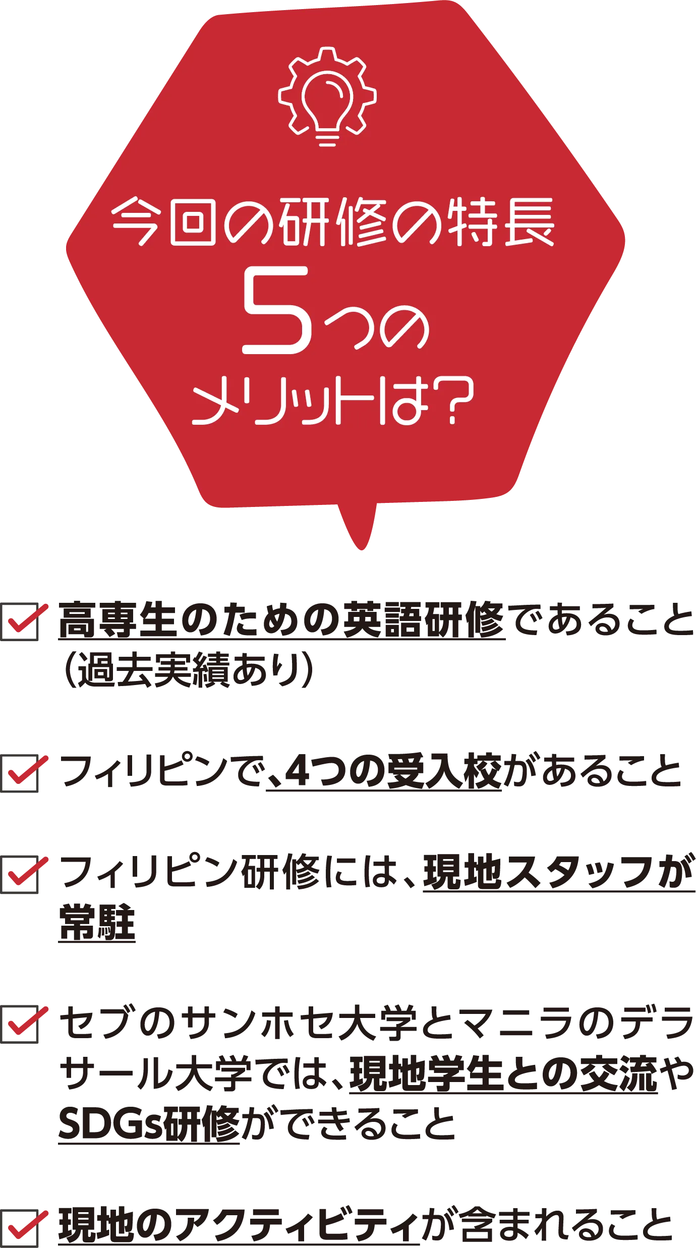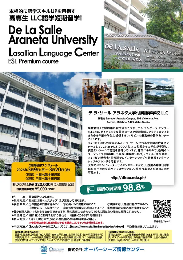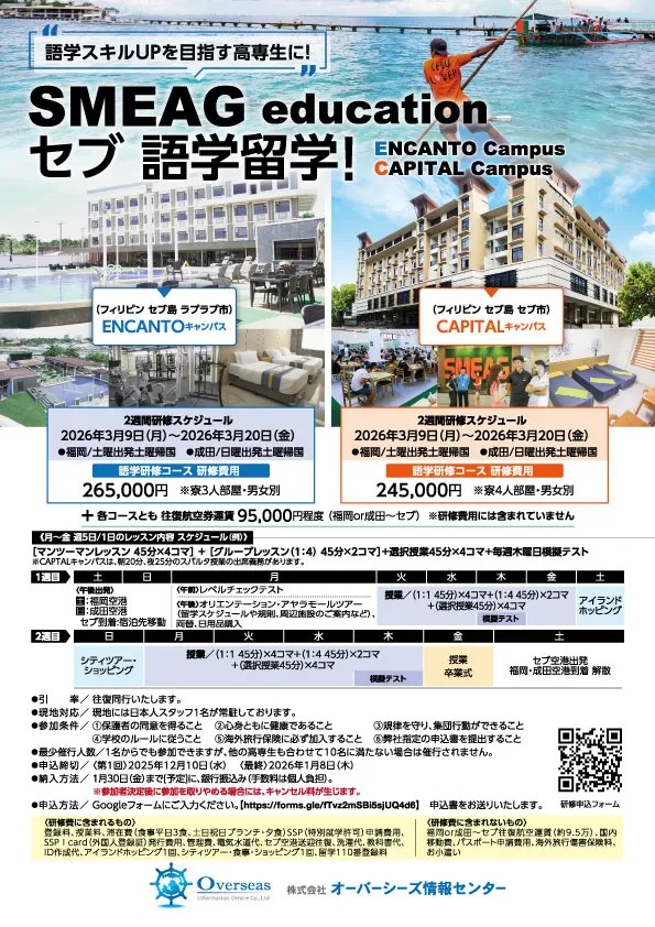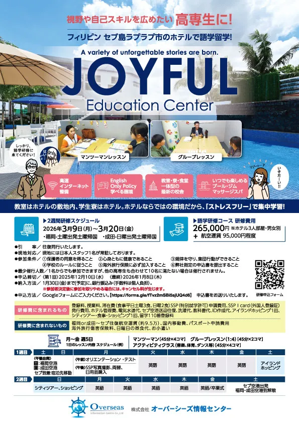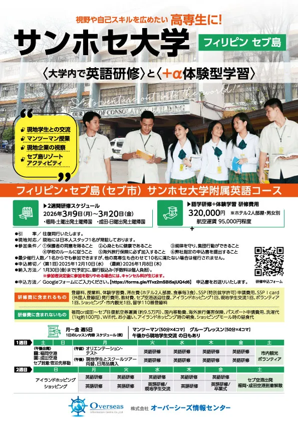 円安が急激に進んだ今、アメリカの語学研修は2週間で70万円などという話も聞きます。その点、フィリピン留学はコストのかかるマンツーマン主体でありながら、2週間27万円です。航空券代を合わせても37万円ほどで渡航可能。さらに、学校単位でご参加の場合、一部の高専では、奨学金の支給があるところもあります。